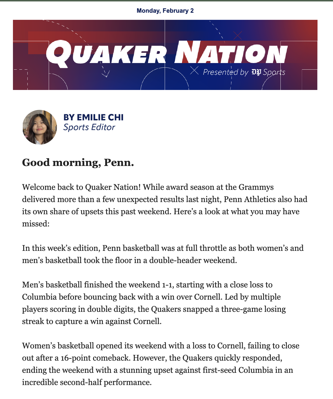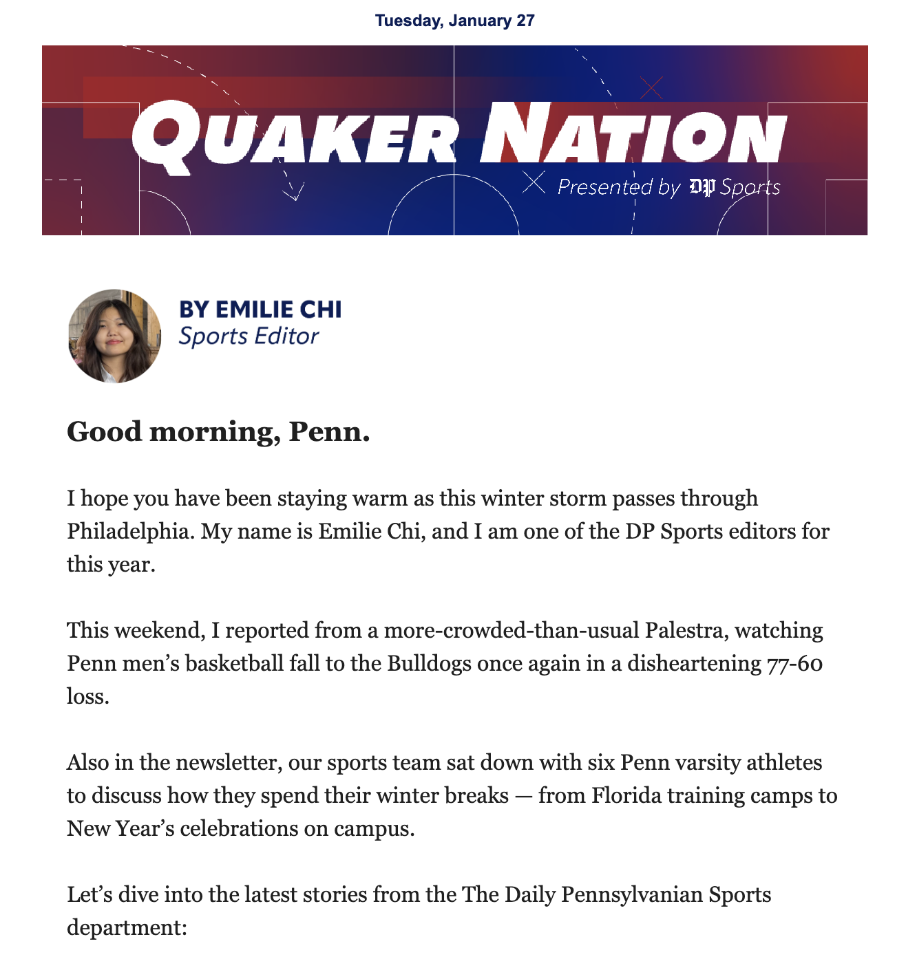 I hope you have been staying warm as this winter storm passes through Philadelphia. My name is Emilie Chi, and I am one of the DP Sports editors for this year.